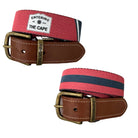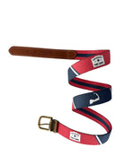 Navy and Red Color Blocks with iconic Cape Cod bookleaf sign and peninsula silhouette, reverses to Doc's Bluffton Stripe. Shown in classic brown leather tab and Antique Brass buckle. Please note, bookleaf signs can be customized to any town in Massachusetts. These make great housewarming gifts. Made in the USA. Cut to Fit sizes 26-42 pant waist.